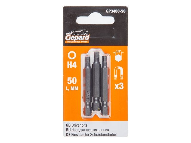 Купить Насадка шестигранник 4мм 1/4" 50мм 3шт GEPARD (GP3400-50) (H4 Hex Shank Hexagon бита под конфирмат сталь S2 магнитная) (GEPARD)